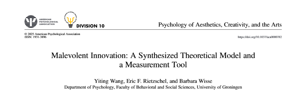 In this article, Yiting Wang, Eric F. Rietzschel, and Barbara Wisse introduced malevolent innovation, which highlights the behavior of generating, championing, and implementing creative ideas, while being fully aware of its potential harm to individuals, organizations, and broader society. Along the way, you will learn the stages through which malevolent innovation occurs, the importance of having this concept measured, and a way to measure malevolent innovation.